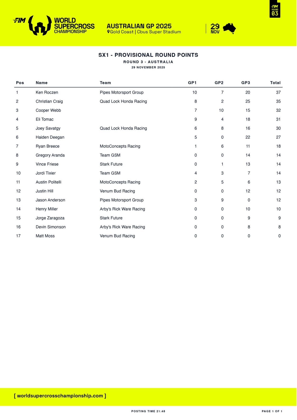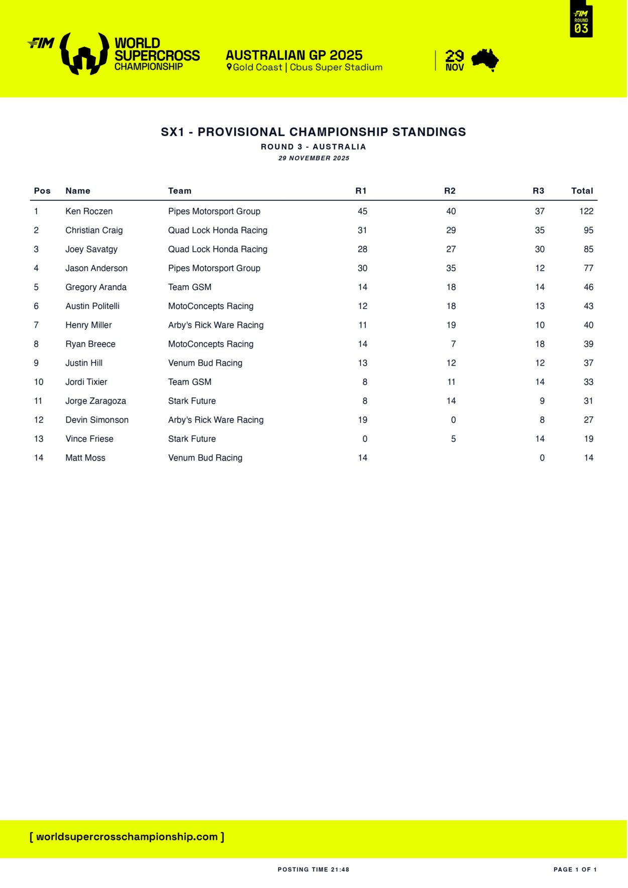 In considerazione delle forze che saranno effettivamente in campo negli ultimi due appuntamenti, infatti, Craig ha impartito una severa lezione agli avversari diretti Joey Savatgy e Jason Anderson. Il primo, autore della Superpole, è risultato più costante nelle sprint, terminando quinto e terzo, ma nella gara più lunga e importante non è riuscito ad emergere concludendo di nuovo quinto e restando giù dal podio assoluto; il secondo è caduto al via di gara-3 e non ha nemmeno completato il primo giro, marcando uno zero pesantissimo in ottica iridata e vanificando la buona piazza d’onore segnata in gara-2.