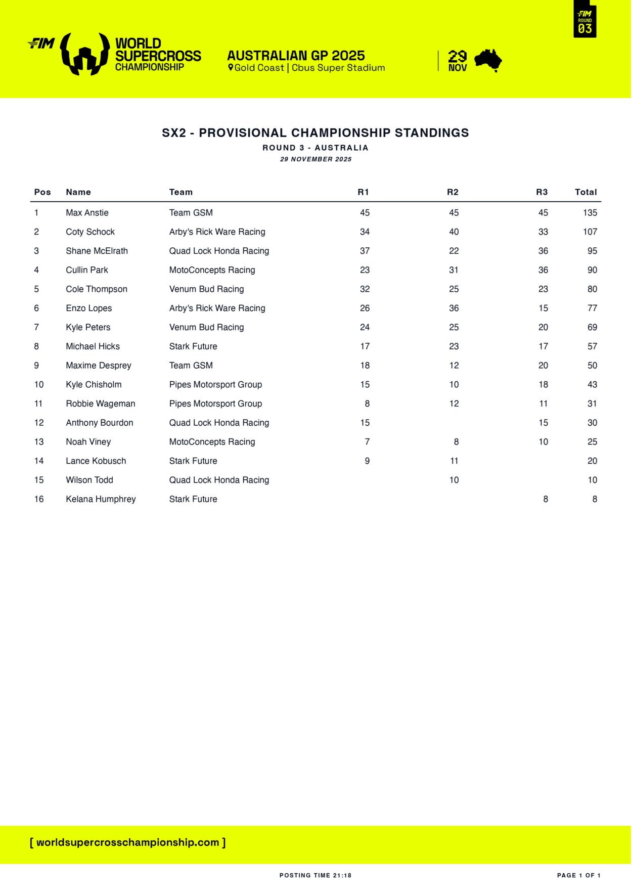 La storia del Gran Premio di Australia è quella di Christian Craig, in forza al team Honda Quadlock che giocava in casa. Per il californiano la serata si è aperta con il terzo posto in gara-1 prima di una disastrosa gara-2, conclusa in nona piazza dopo due cadute rovinose; il capolavoro dell’ex campione AMA 250cc West è arrivato però dalla finalissima, quando si è liberato di Haiden Deegan e dello stesso Tomac nelle prime fasi per poi involarsi solitario verso la bandiera a scacchi. L’argento overall sa di grande rivincita nei confronti di chi lo ha messo da parte recentemente (tra le polemiche) e soprattutto ha rilanciato le sue quotazioni in chiave classifica generale.