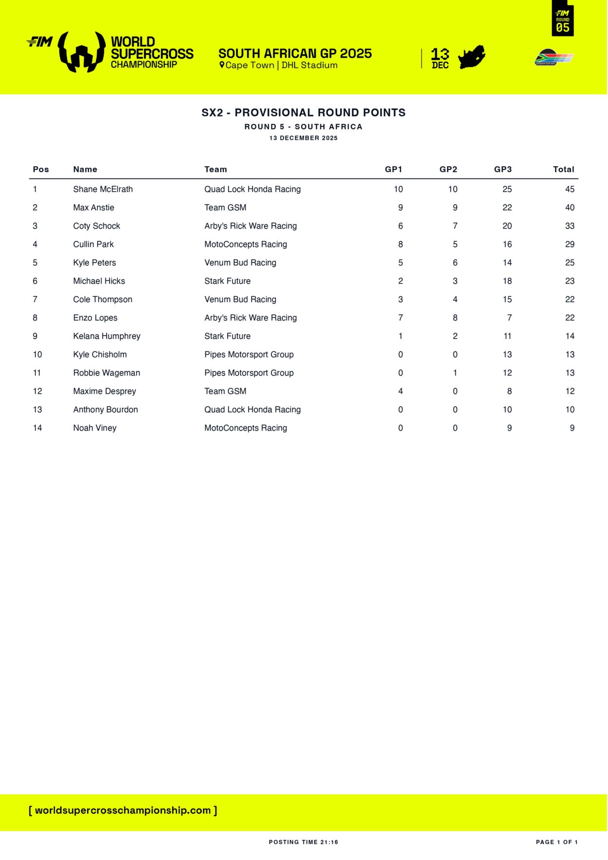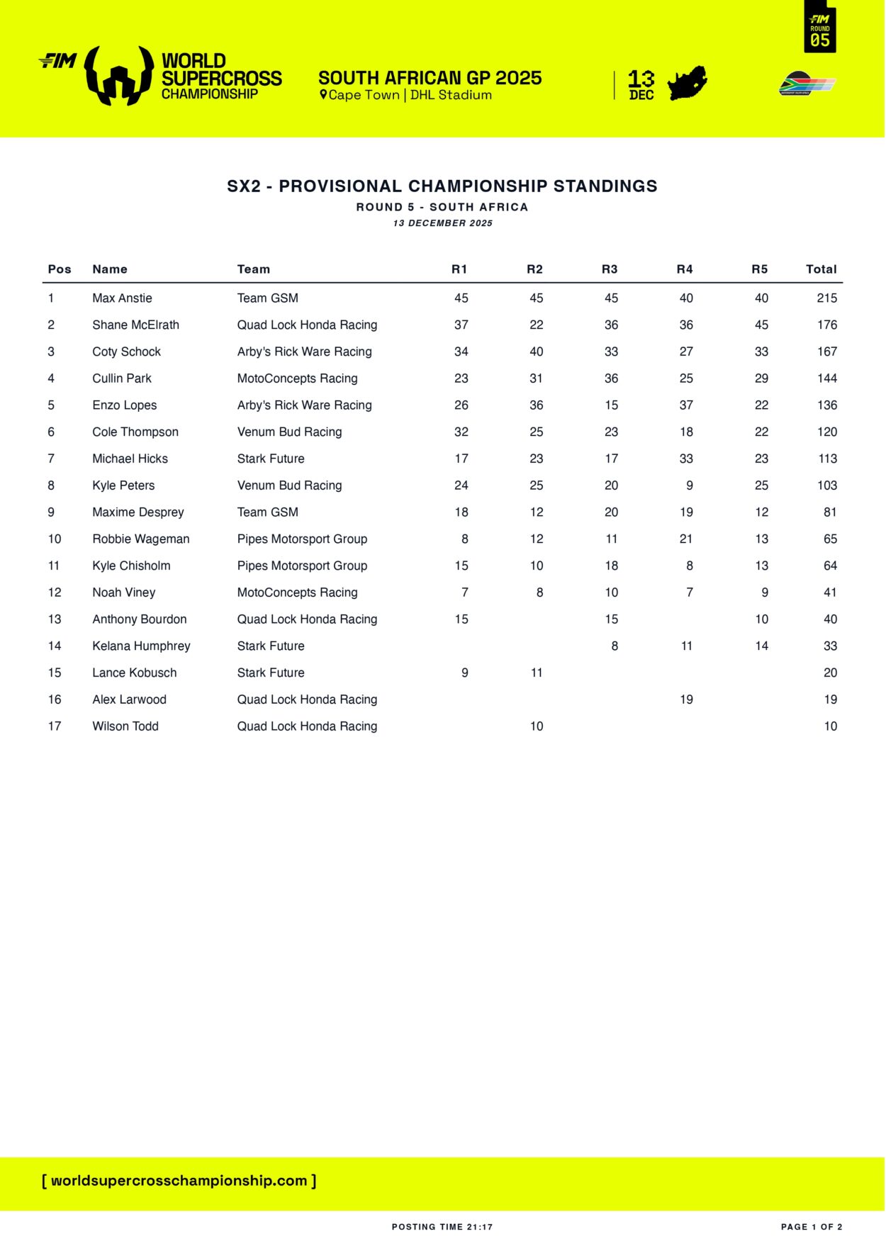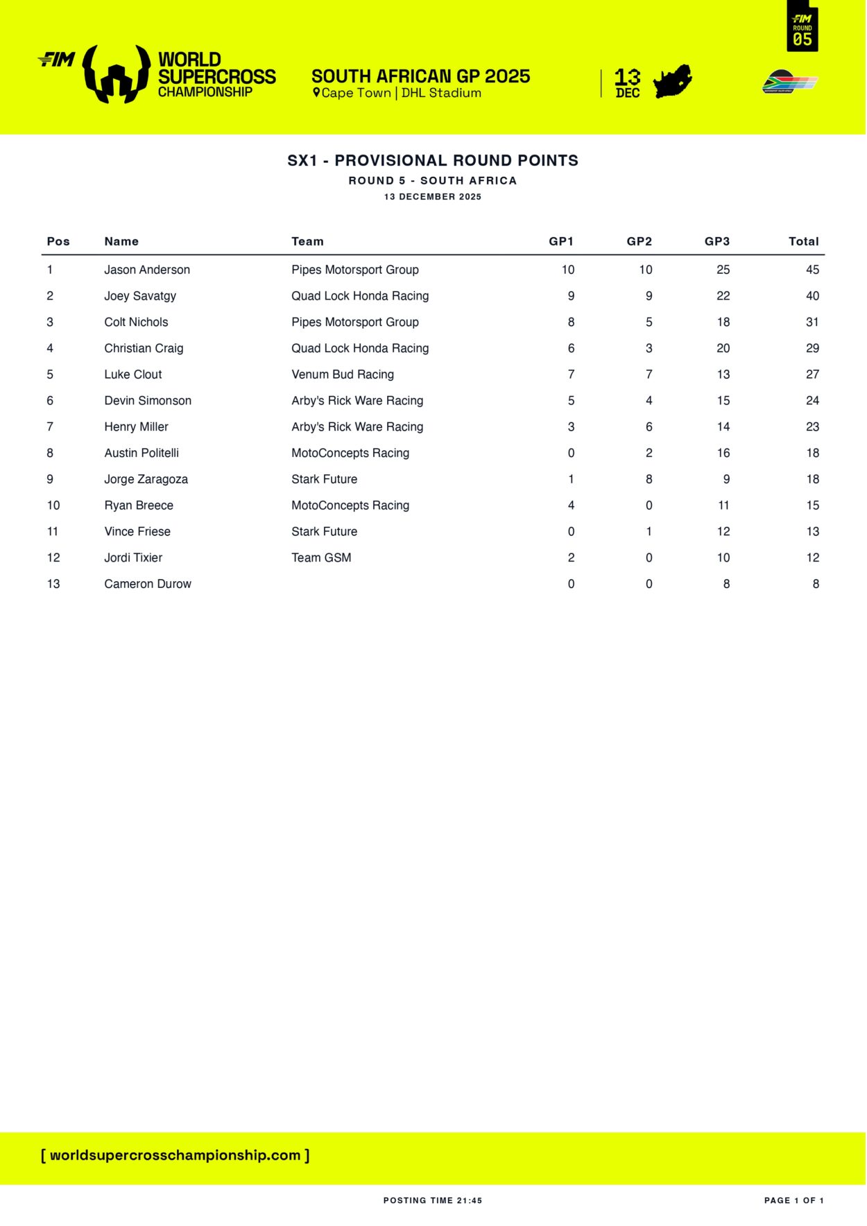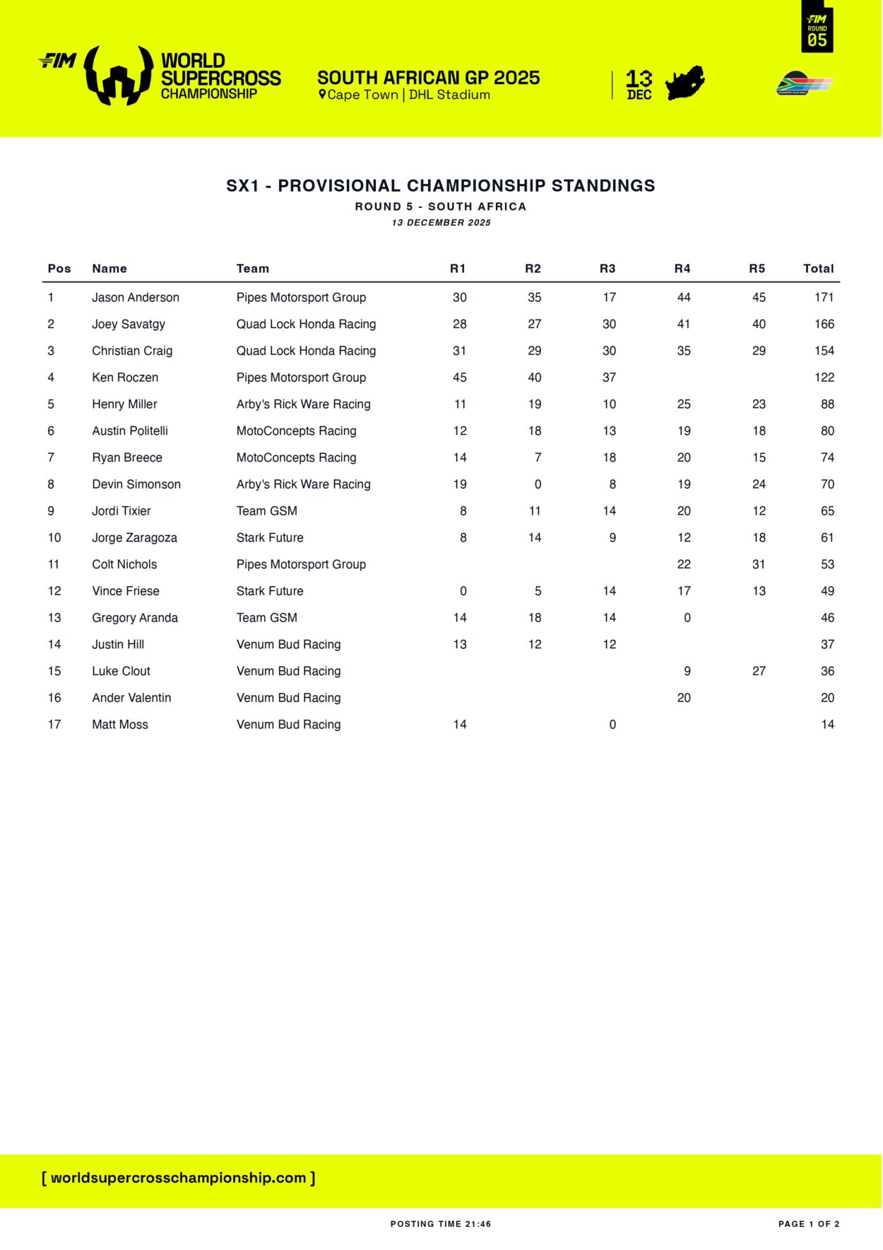 La classifica finale incorona Anderson con 171 punti contro i 166 di Savatgy e i 154 di Craig, il cui -5 incassato in Australia per avere violato una bandiera medica non ha modificato l’esito della stagione. Quarto Roczen, grandissimo protagonista nei primi tre round ma fermato dall’accordo chiuso in anticipo con SX Global: l’ampio vantaggio maturato fino in Australia avrebbe reso la competizione per il titolo SX1 molto meno appassionante. Titolo costruttori a Suzuki con 211 punti davanti a Honda con 176.