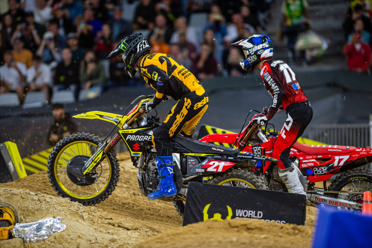 Max Anstie aveva necessità di conquistare una manciata di punti per assicurarsi il secondo titolo mondiale SX2 in carriera e già in gara-1, senza sorprese, la contesa si è risolta grazie alla piazza d’onore conseguita. Una volta celebrato l’alloro il britannico ha cercato di prendersi anche l’en-plein per quanto riguarda le vittorie assolute, ma questa volta ha trovato sulla sua strada uno Shane McElrath più determinato che mai.