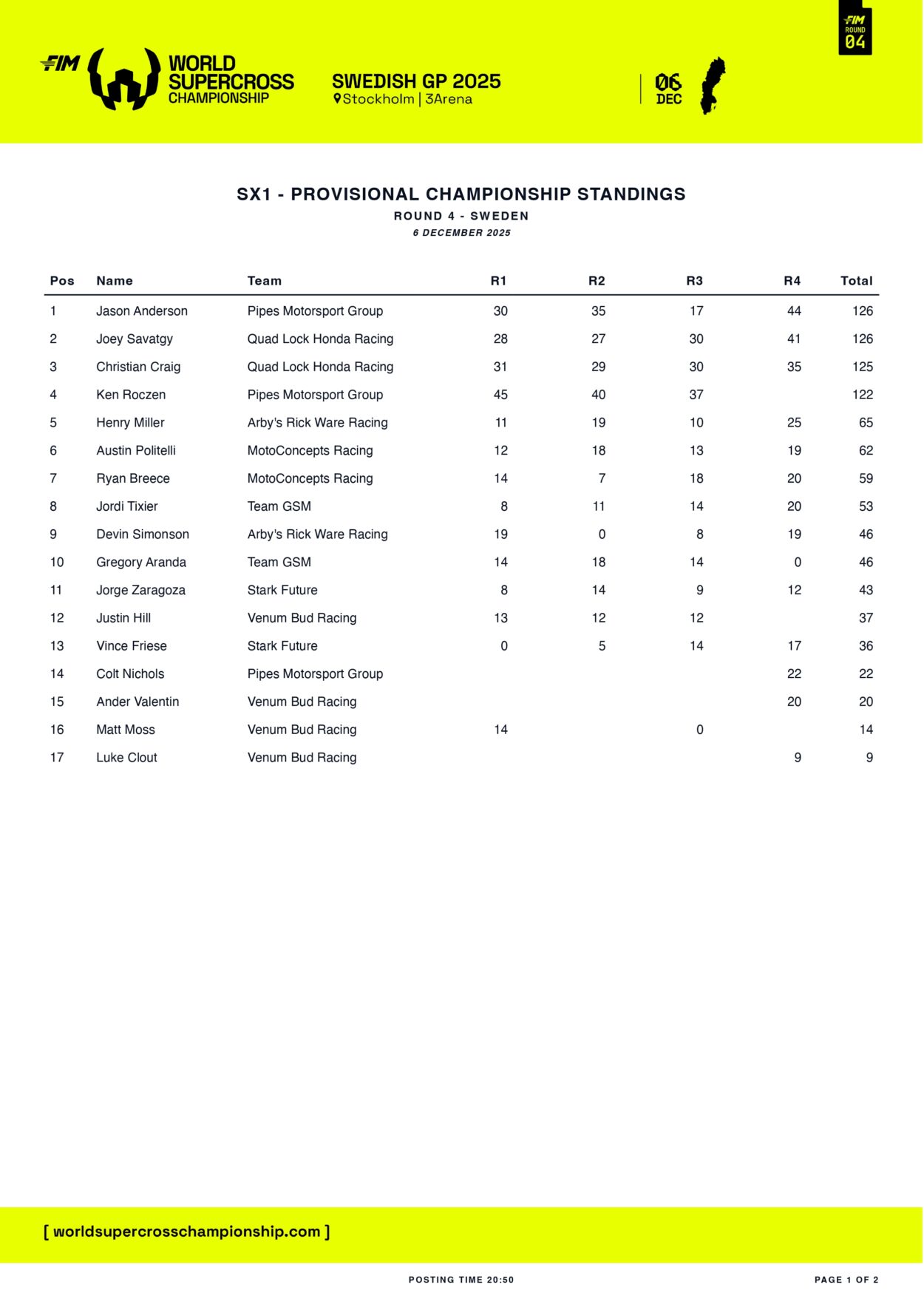 La classifica del campionato SX1 è quanto di più clamoroso si potesse immaginare. Anderson e Savatgy guidano con 126 punti e una sola lunghezza di margine su Craig, il che significa che i tre partiranno praticamente con le stesse chance di aggiudicarsi il titolo. La classifica costruttori è invece largamente a vantaggio di Suzuki con 166 punti contro i 136 di Honda.