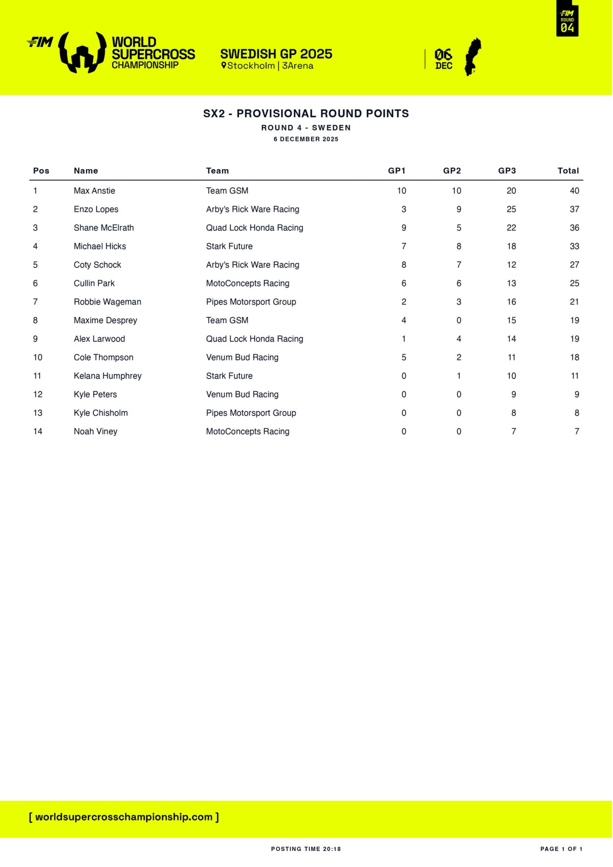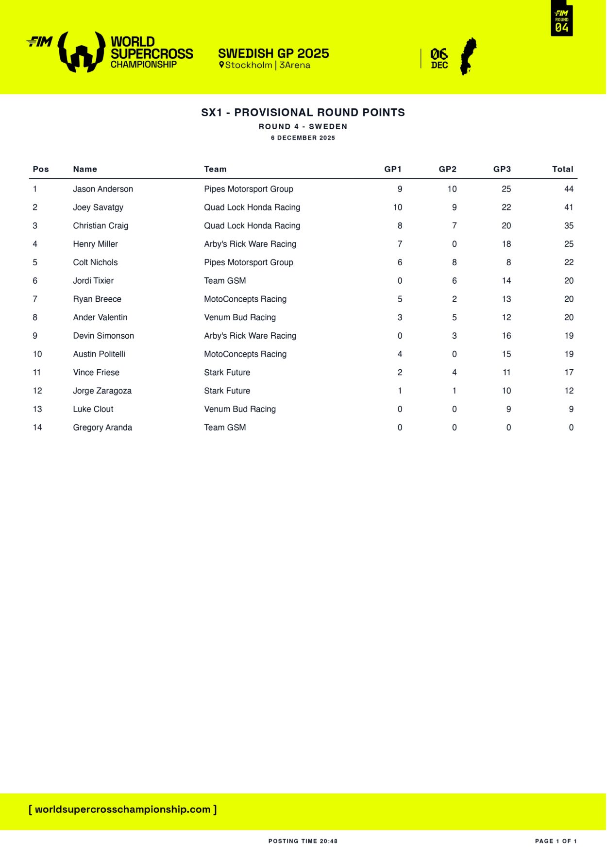 Sensazioni molto diverse rispetto a sette giorni fa per Christian Craig, che questa volta si è dovuto accontentare della terza posizione overall con un terzo posto in apertura e chiusura e un quarto in gara-2 a seguito di una caduta in avvio. Sul fondo segnato di Stoccolma il californiano non ha trovato il giusto ritmo ma ha portato a casa quasi il massimo possibile, restando pienamente nella corsa per il titolo.
