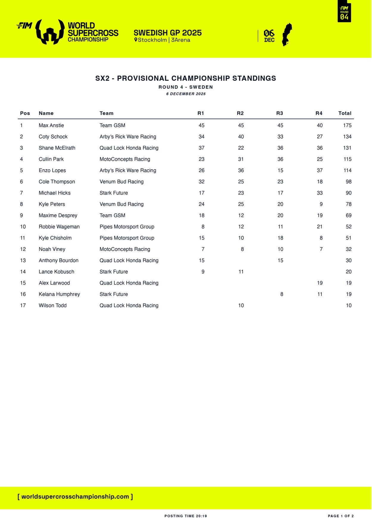 Con 45 punti ancora in palio Anstie ne ha 41 su Schock e 44 su McElrath, pertanto basterà un modesto piazzamento nella gara inaugurale dell’ultimo evento per mettere sul proprio capo la seconda corona SX2 della sua carriera. Situazione analoga in classifica costruttori con Yamaha a 175 punti e Honda a 140. Il campionato squadre vedrà Quadlock Racing partire in pole position con 441 punti contro i 373 di Pipes Motorsports Group e i 359 di Rick Ware Racing.